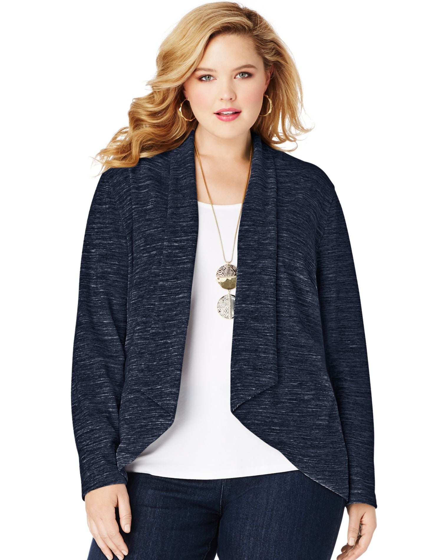 • Open flyaway front helps camouflage hips and tummy.