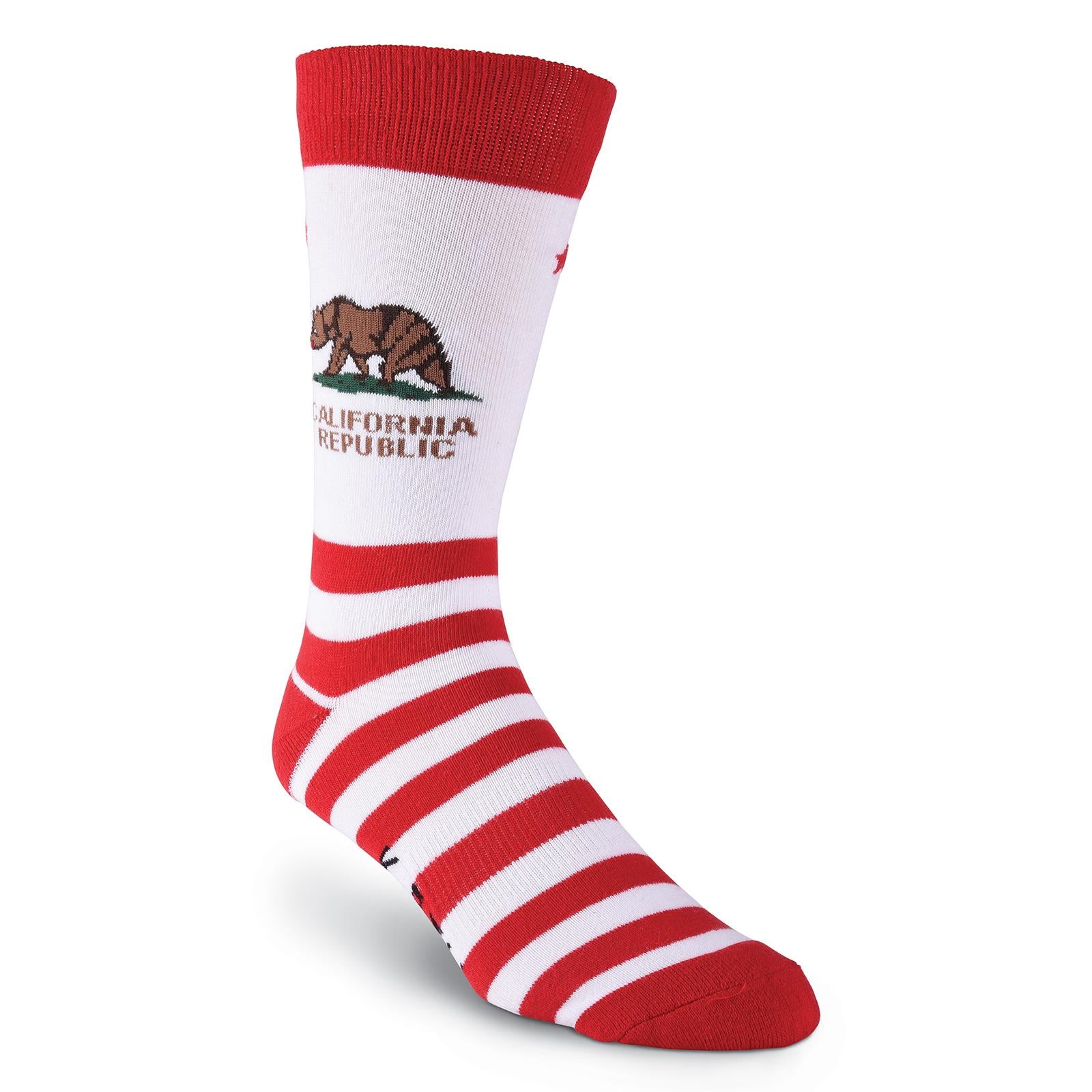 • This pair of crew socks for men feature an allover red and white striped pattern and red trim, plus a California Republic bear graphic on the leg