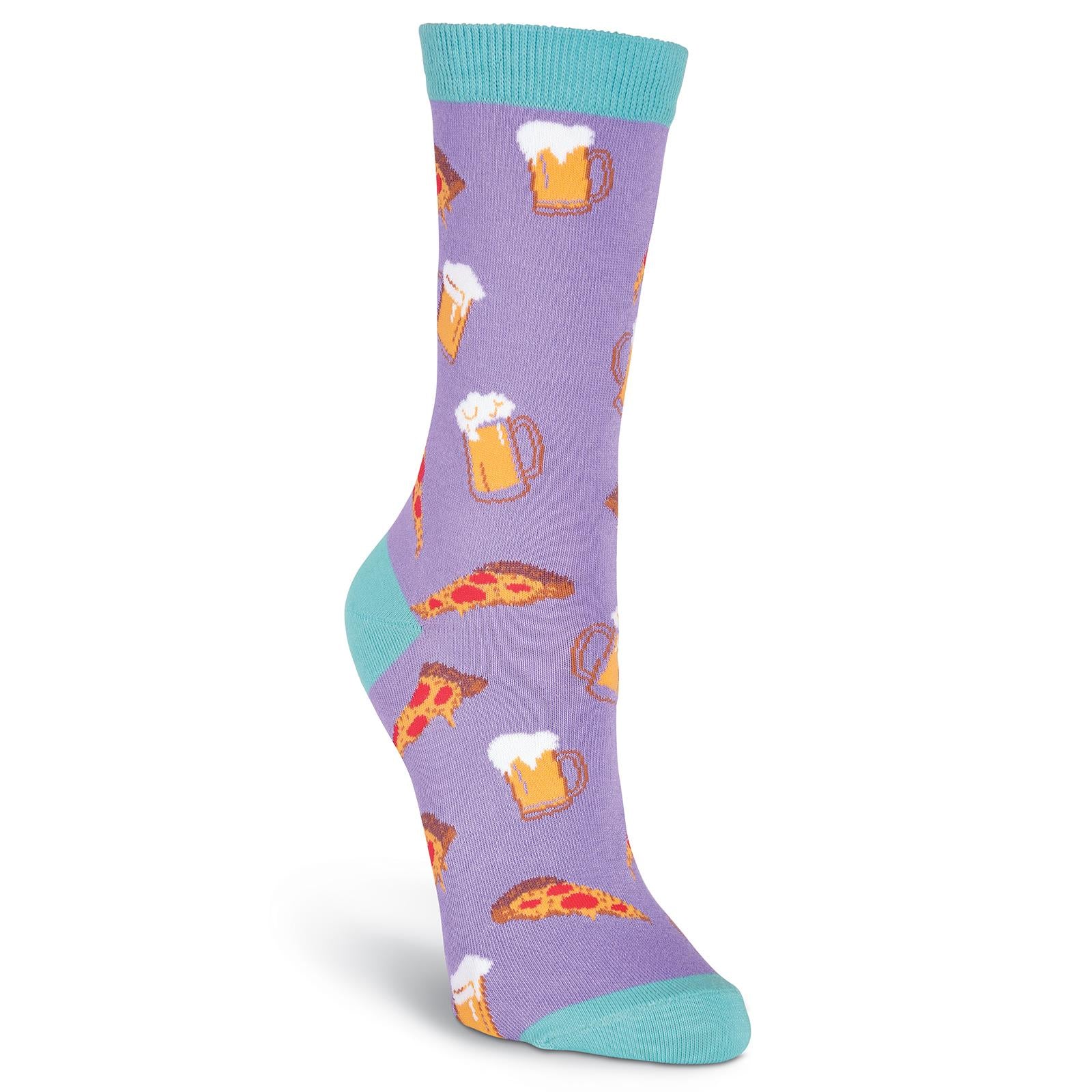 • Featuring a fun pattern and pops of color on the heel, toe, and top, these women’s pizza and beer crew socks are a great treat!